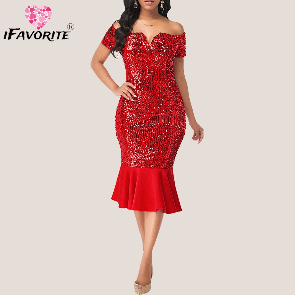 Ifavorite Women Fish Tail Skirt Red Party Dress Elegant Sequins Off Shoulder Cocktail Wedding Gown Shopee Philippines